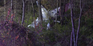 The plane landed nose-first into trees.